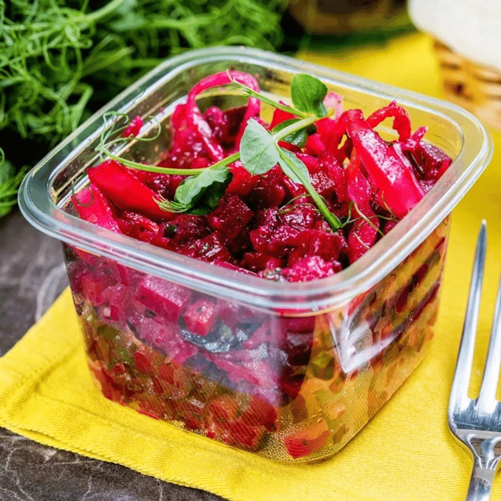 Состав: картофель,морковь,свёкла,капуста белокочанная,огурцы маринов.,горошек консерв.,петрушка,укроп,масло подсол.,соль,перец