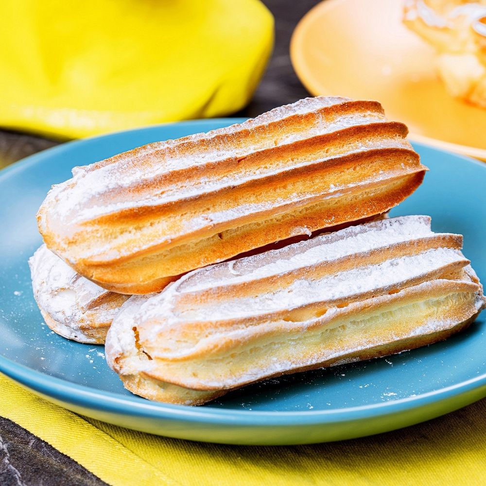 Торты и пирожные. Эклер с кремом.Состав: тесто (мука в/с, вода, масло сливочное, яйцо куриное, соль), начинка (сыр творожный, молоко сгущеное, сливки натуральные 22%, сахар, ванилин, соль). Пищевая ценность в 100 г. продукта: белки 4,65 г., жиры 20,46 г., углеводы 20,07 г., Энергетическая ценность в 100 г. продукта – 290,99 ккал/1218,32 кДж. Срок годности: при t 4±2 ºC не более 72 часов. МАССА НЕТТО ОДНОГО ИЗДЕЛИЯ 60 ± 5 г.