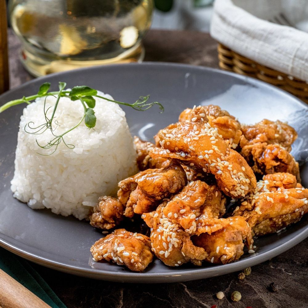 Состав:курица, рис, кунжут, соус рисовый, соус соевый, крахмал картофельный, перец чёрный, сахар, соль. Подаётся с веточкой микрозелени. Пищевая ценность в 100 г. продукта: белки 0,624 г., жиры 1,307 г., углеводы 4,8 г. Энергетическая ценность в 100 г. продукта – 33,456 ккал/140,07 кДж. Срок годности: при t 4±2 ºC не более 72ч.