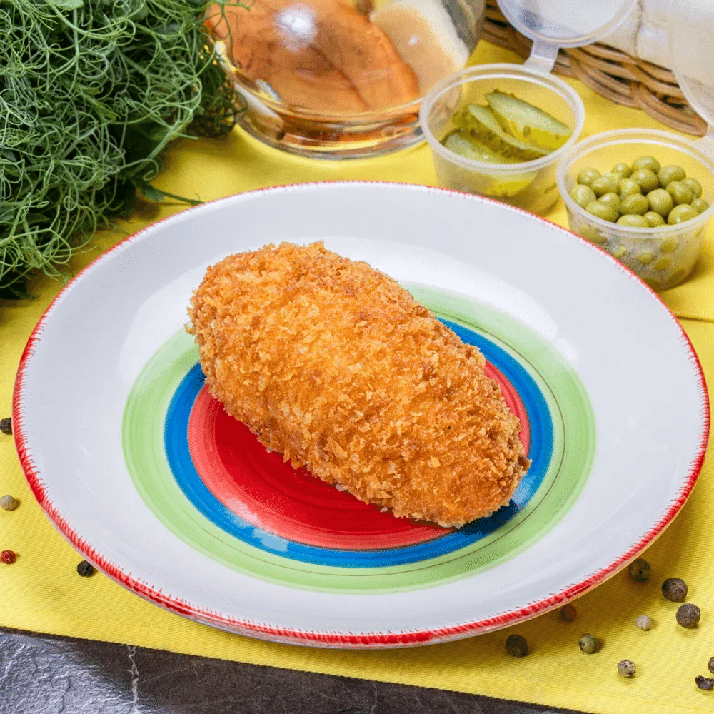 СТО 37676459-020-2023 Вторые обеденные блюда горячие, охлажденные и замороженные. Состав: филе бедра куриное, лук репчатый, петрушка, укроп, чеснок, масло сливочное, бульон куриный, перец черный, соль, сухари панировочные, горошек консерв., огурец маринов., хлеб черный. Пищевая ценность в 100 г. продукта: белки 8,158 г., жиры 8,302 г., углеводы 21,756 г. Энергетическая ценность в 100 г. продукта – 194,378 ккал/813,22 кДж. Срок годности: при t 4±2 ºC не более 72 часов.