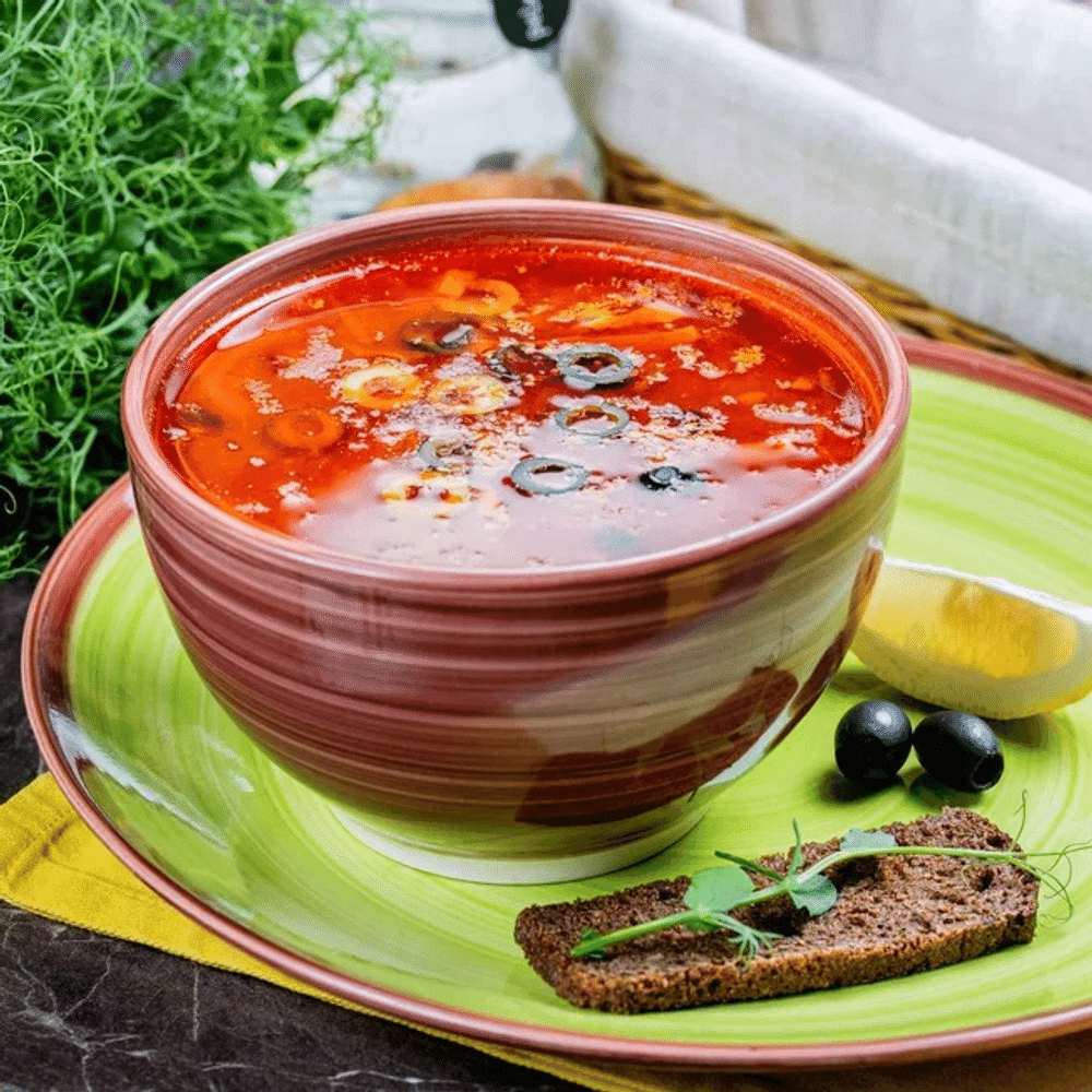 Состав: ветчина, колбаса в/к, бекон, лук репчатый, маслины, оливки, огурец маринованный, паста томатная, лимон, лавровый лист, уксус, бульон говяжий, соль. Подается со сметаной и черным хлебом.