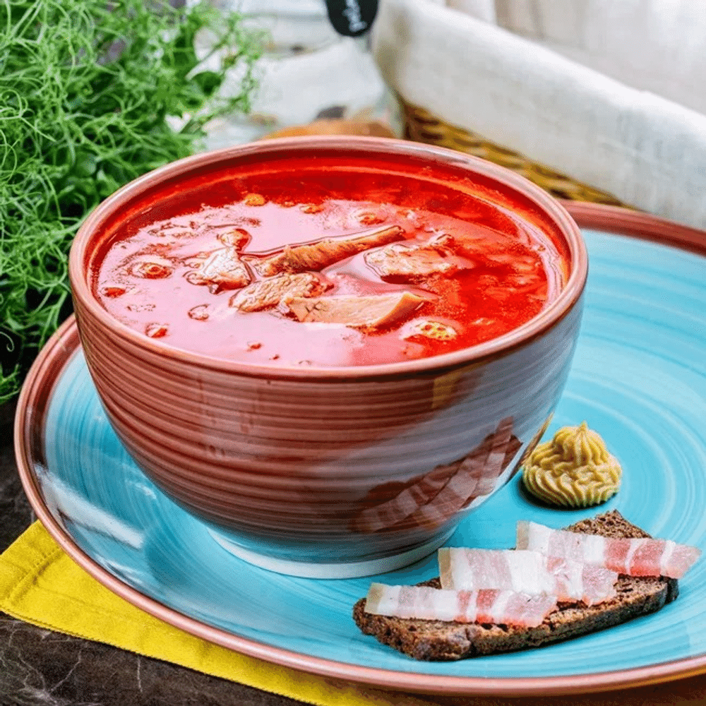 Состав: говядина, картофель, морковь, свёкла, капуста б/к, лук репчатый, чеснок, масло подсолнечное, паста томатная, сахар, соль, перец горошком, лавровый лист, уксус. Подается с салом, черным хлебом и горчицей.